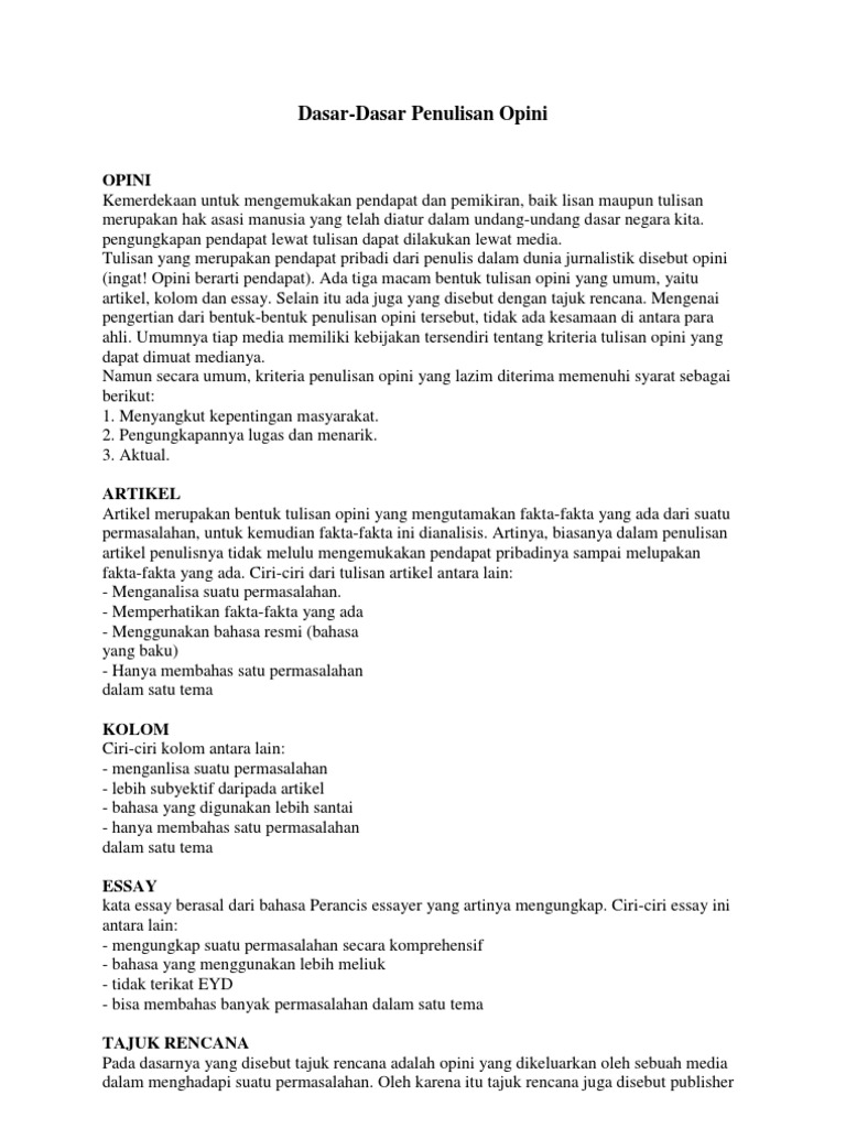 Cara Menulis Opini from imgv2-1-f.scribdassets.com Bagaimana cara menulis opini dengan cepat dan mudah? Nah, bagaimana dengan menulis opini? Contoh artikel opini di koran u gunarso blog: Contoh artikel opini supaya sahabat bisa memahaminya lebih mudah. Isu yang diangkat merupakan pembicaraan yang sedang hangat di lampiran 3. Nah, persoalan tersebut adalah contoh nyata opini menjadi efek samping dari fakta. Menulis dan mengirimkan tulisan artikel opini yang ditulis ke media massa cetak (koran harian surat kabar) yang dituju membutuhkan perjuangan dan komitmen. (materi ini pengantar training penulisan opini mahasiswa dan guru di universitas tirtatayasa banten dan universitas soedirman purwokerto, juni 2011).